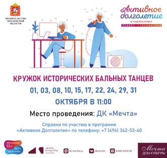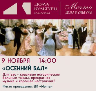 9 ноября в 14:00 ДК «Мечта» приглашает вас окунуться в неповторимую атмосферу настоящего бала Кружок исторического бального танца проведет «Осенний бал» в рамках губернаторской программы «Активное Долголетие». Вход свободный! Не пропустите!