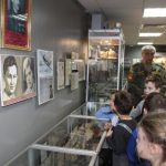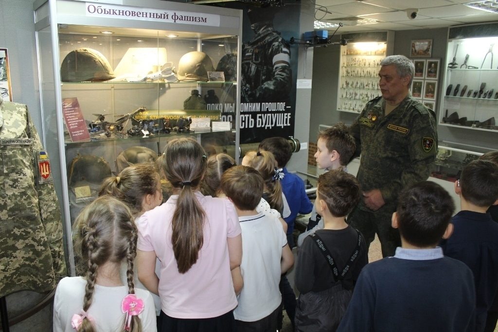 У выставочного стенда «Обыкновенный фашизм», оформленного из предметов, собранных поисковиками отрядов «ВОЕННАЯ АРХЕОЛОГИЯ» и «БУМЕРАНГ — ДОСААФ» города Наро-Фоминска в ходе гуманитарных миссий в зону СВО, ребята задержались особенно долго.