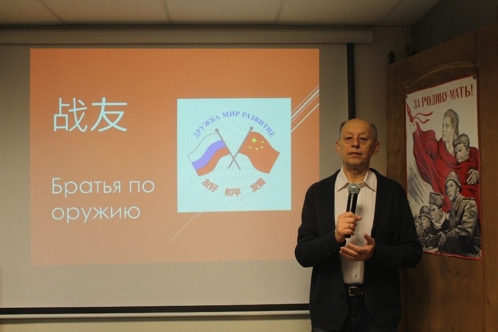 Победа над фашисткой Германией и милитаристской Японией – общий праздник России и Китая, поэтому на экране лекционного зала демонстрировались кадры военных парадов в 2025 году и в Москве, и в Пекине.