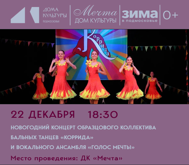 Место: Дом культуры «Мечта» Что вас ждёт: завораживающие бальные танцы от коллектива «Коррида»;