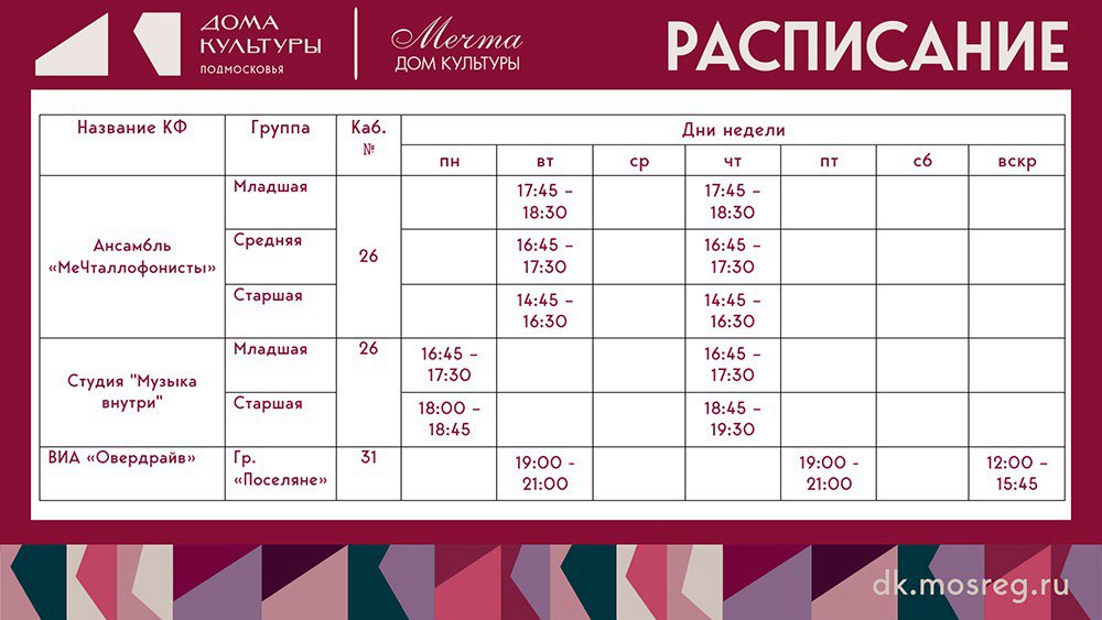 Занятия проводятся на репетиционной базе Дома Культуры «Мечта» по вторникам, средам и четвергам с 15 до 19 часов.
