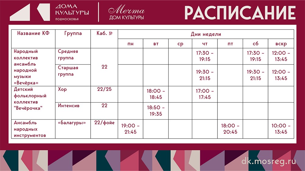 В репертуаре коллектива народные песни, танцы и инструментальные наигрыши разных областей России, сочинения современных авторов, духовная музыка. Так же в творческом арсенале коллектива насколько фольклорных спектаклей – «Масленица», «Сказка про Васку», «Красная горка», «Вертеп», «Золотое зёрнышко», «Кукольная свадебка». Фольклорный спектакль «Святковская вечорка» получил Диплом Лауреата на театральном фестивале «Когда открывается занавес». В сезоне 2022-2023 гг. коллектив продолжил проект «Воскресные встречи. Споем вместе» в рамках Губернаторской программы «Активное долголетие». В марте 2023 ансамбль выступил с большим сольным концертом в рамках проекта Министерства культуры МО «Арт-визит» в КЦ «Ершово».