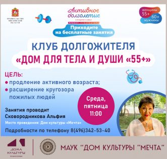 Дом культуры «Мечта» приглашает каждую среду и пятницу в 11:00 на бесплатные занятия Клуба долгожителя «Дом для тела и души «55+». Цель Клуба: - продление активного возраста; - расширение кругозора пожилых людей. В программе: 1. Суставная гимнастика [...]