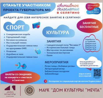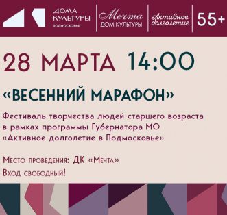Дом культуры «Мечта» приглашает 28 марта в 14.00 на фестиваль творчества «Весенний марафон» — яркое событие в рамках программы губернатора Московской области «Активное долголетие в Подмосковье», где люди старшего возраста покажут, что талант и энерги [...]