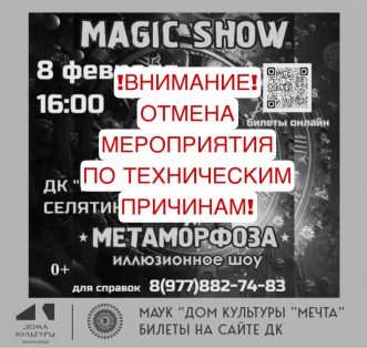 !Внимание! По техническим причинам иллюзионное шоу «Метаморфоза» отменено. Возврат денежных средств будет осуществлён автоматически. Приносим извинения за доставленные неудобства.