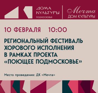 Внимание, любители хорового искусства! ✨10 февраля в ДК «Мечта» пройдёт Региональный фестиваль хорового исполнения в рамках масштабного проекта «Поющее Подмосковье»! Дата: 10 февраля 🕧 Время: 10:00 Место: ДК «Мечта» Вас ждёт: • яркие выступ [...]