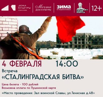Дорогие друзья! ДК «Мечта» приглашает вас 18 февраля в 14:00 на памятную встречу «Сталинград — синоним Победы», посвящённую одной из самых героических страниц нашей истории – Сталинградской битве. Это событие навсегда вписано в летопись мужества и ст [...]