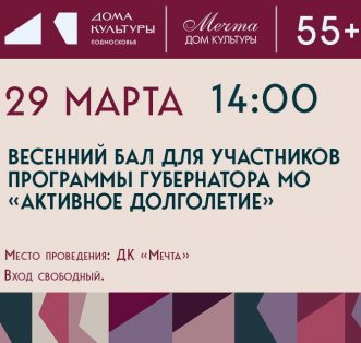 Дорогие друзья! Приглашаем вас окунуться в чарующую атмосферу красоты и грации на танцевальном вечере «Весенний бал»! Он состоится 29 марта в 14:00 в Доме культуры «Мечта» и пройдёт в рамках программы Губернатора Московской области «Активное долголет [...]