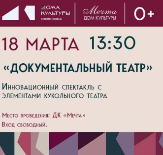 «Документальный театр» в ДК «Мечта» Событие, которое ты не забудешь! Интерактивный документальный театр в формате «полное погружение», с элементами кукольного театра! Никаких кресел, скучных лекций и зрителей. Ты — в центре. Ты — актёр. Ты — часть ис [...]