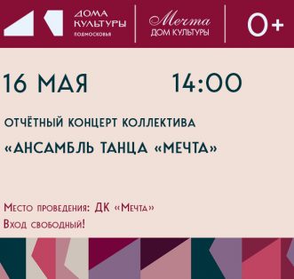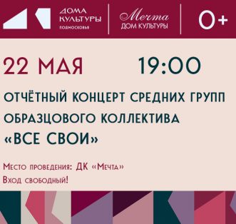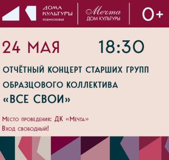 Дорогие друзья! 24 мая в Доме культуры «Мечта» состоится отчётный концерт старших групп образцового коллектива «Все Свои» — и мы очень хотим видеть вас там! Этот вечер станет настоящим праздником творчества: вы увидите результаты упорного труда,услыш [...]