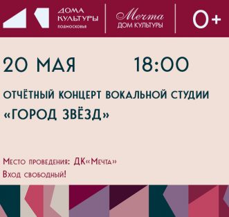 Друзья! Приглашаем вас 20 мая в 18:00 на отчётный концерт вокальной студии «Город звёзд» — событие, посвящённое итогам творческого года. Ждём всех желающих! Вход свободный!