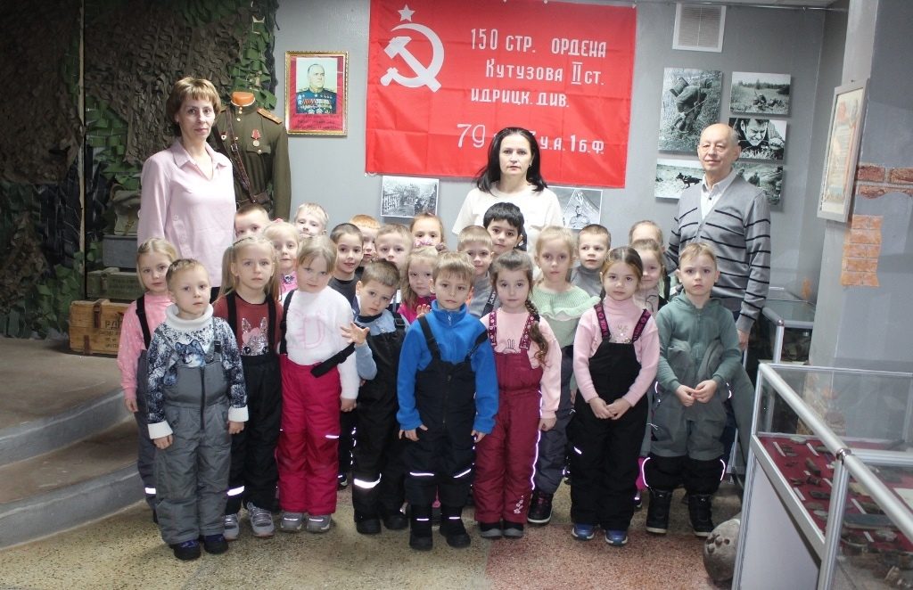 После беседы, посвященной событиям Великой Отечественной войны, ребята сфотографировались в выставочном комплексе Зала у Знамени Победы и осмотрели выставку детских рисунков «Война глазами детей», составленную из работ учащихся ДШИ «Классика» поселка Калининец.