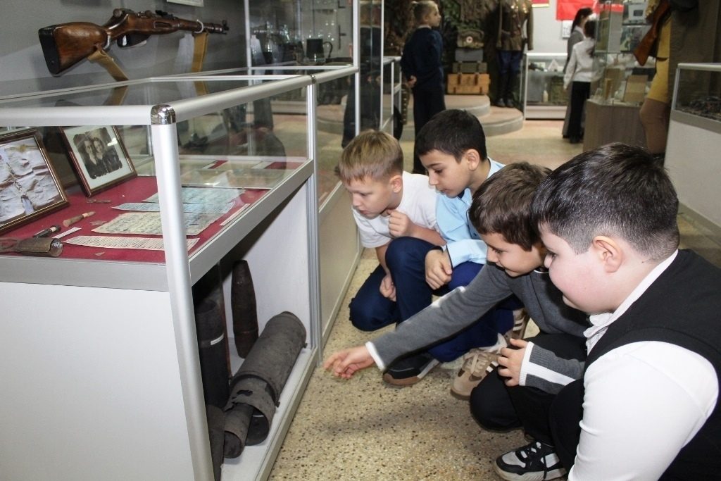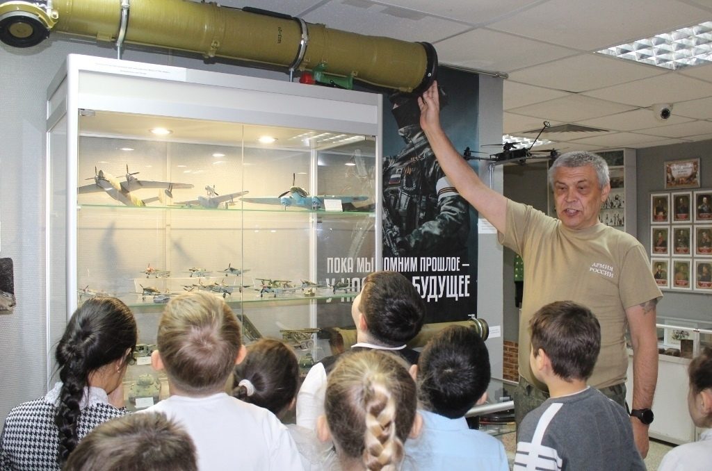 После беседы ребята осмотрели экспонаты в зале военной археологии, где не только увидели модели «Катюши» различного масштаба, но и смогли прикоснуться к обломкам разорвавшегося реактивного снаряда, найденного поисковиками на местах боев недалеко от Таширово.