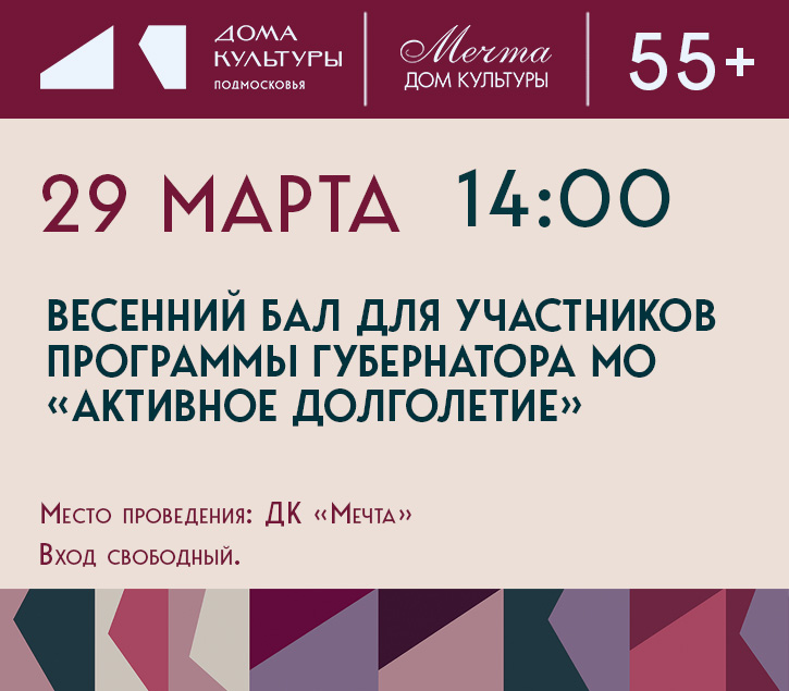 Дорогие друзья! Приглашаем вас окунуться в чарующую атмосферу красоты и грации на танцевальном вечере «Весенний бал»! Он состоится 29 марта в 14:00 в Доме культуры «Мечта» и пройдёт в рамках программы Губернатора Московской области «Активное долголетие в Подмосковье». Вас ждёт незабываемый день, наполненный: