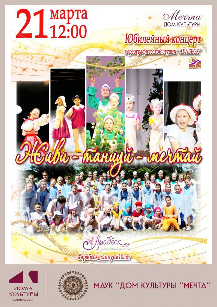 Праздничный концерт, посвященный 10-летию Хореографической студии «Арабеск» Дома творчества Селятино, объединит зрителей и артистов, близких и дорогих сердцам родных и друзей, где каждый номер программы станет ярким подарком поклонникам прекрасного мира танца и музыки.