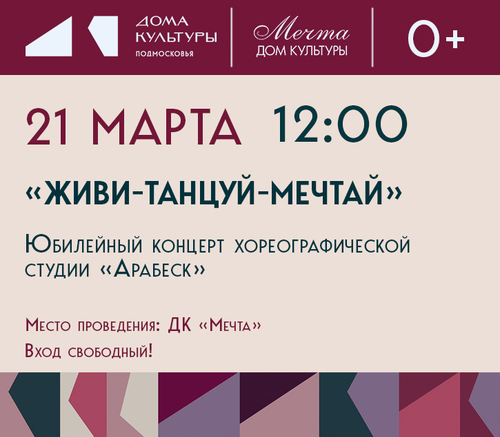 Праздничный концерт, посвященный 10-летию Хореографической студии «Арабеск» Дома творчества Селятино, объединит зрителей и артистов, близких и дорогих сердцам родных и друзей, где каждый номер программы станет ярким подарком поклонникам прекрасного мира танца и музыки.