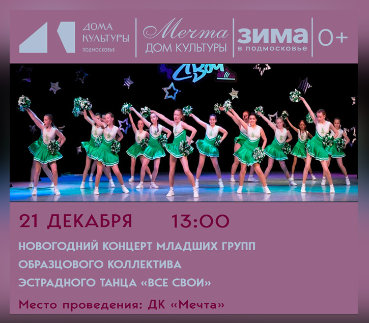 21 декабря в 13:00 в нашем ДК «Мечта» пройдёт новогодний концерт младших групп образцового коллектива эстрадного танца «Все Свои».