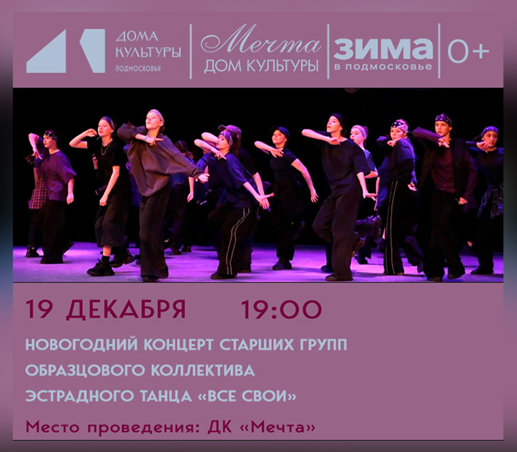 19 декабря в 19:00 в ДК «Мечта» мы приглашаем вас на новогодний концерт старших групп образцового коллектива «Все Свои». Это идеальный способ: