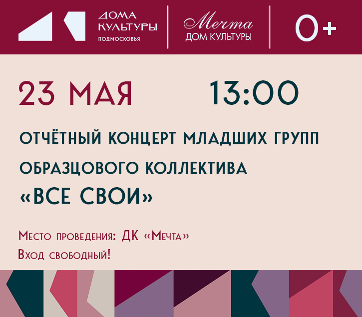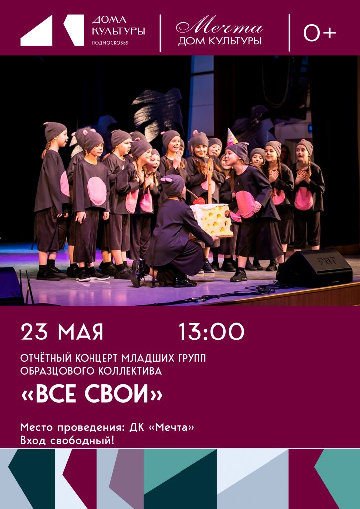 Приглашаем вас на отчётный концерт младших групп образцового коллектива «Все свои» — пустьих первые большие шаги на сцене станут праздником для всех нас!